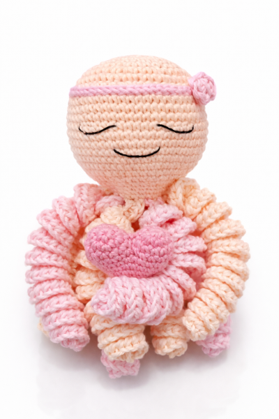 Delicado, aconchegante e cheio de significado, o Polvo do Amor em amigurumi foi criado para oferecer conforto e segurança aos pequenos. Seus tentáculos enroladinhos lembram o cordão umbilical, trazendo ao bebê uma sensação familiar e acolhedora, semelhante à que ele sentia no ventre da mãe.