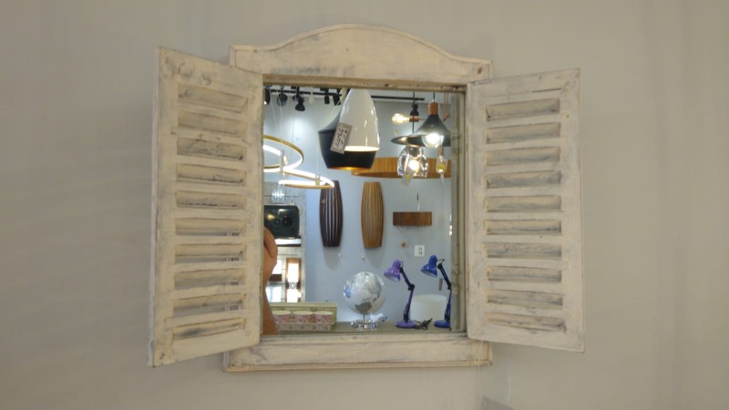 ESPELHO JANELA COM MOLDURA EM MADEIRA