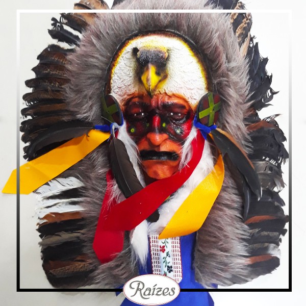 Arte Realista "Índio Xamã" feito de fibra, com cocar de penas tingidas e diversos acessórios em tecidos, miçangas e plumas.